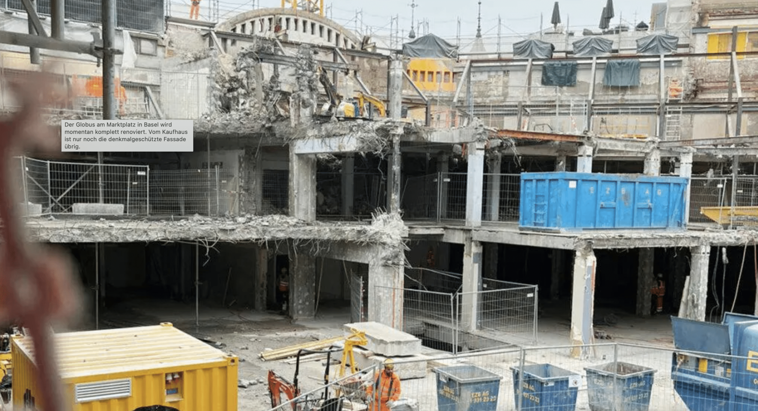Das Kaufhaus Globus am Marktplatz in Basel wird zurzeit umgebaut. Seit knapp einem Jahr besteht die Baustelle bereits. Nun wurden auf dem renommierten Blog Architektur Basel Bilder der Grossbaustelle veröffentlicht. In den sozialen Medien schlagen die Fotos hohe Wellen. Es scheint, als ob das Ausmass des Umbaus nun vielen Userinnen und Usern so richtig klar wird.